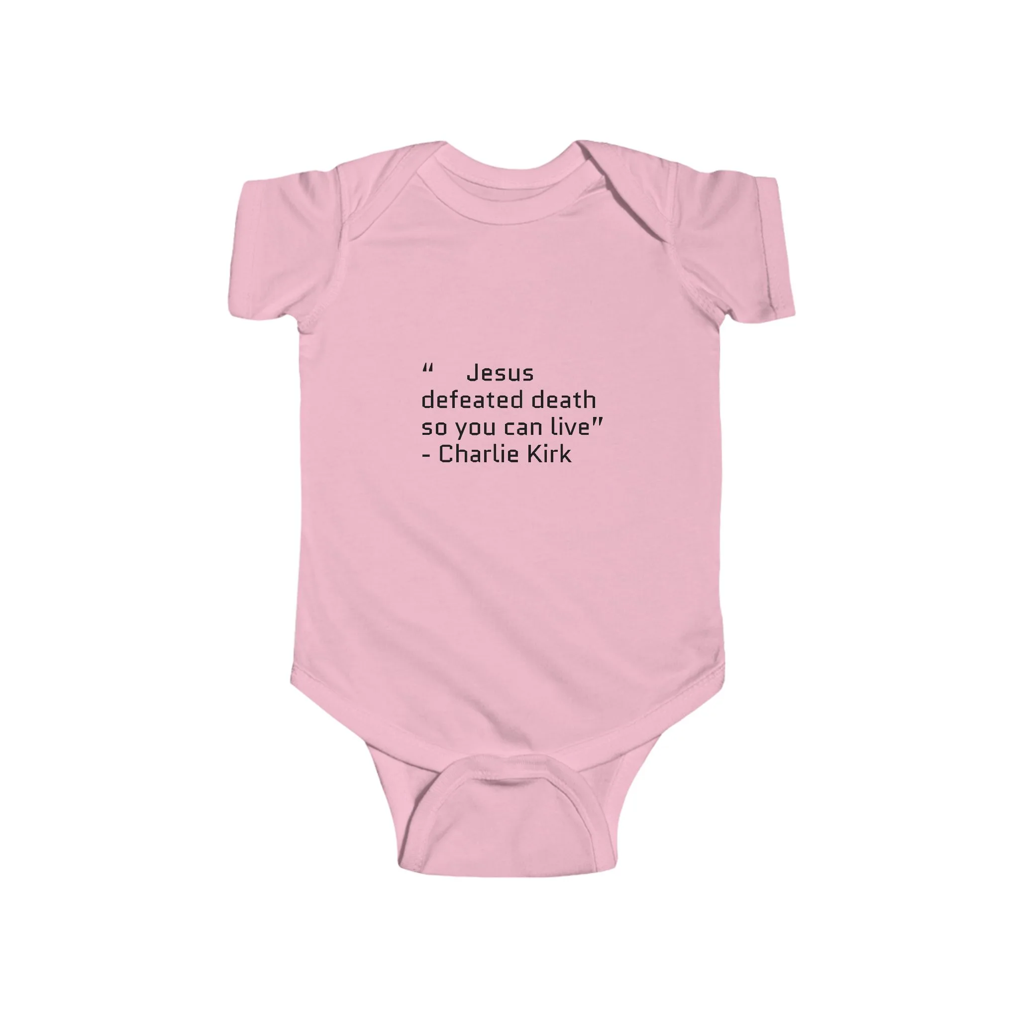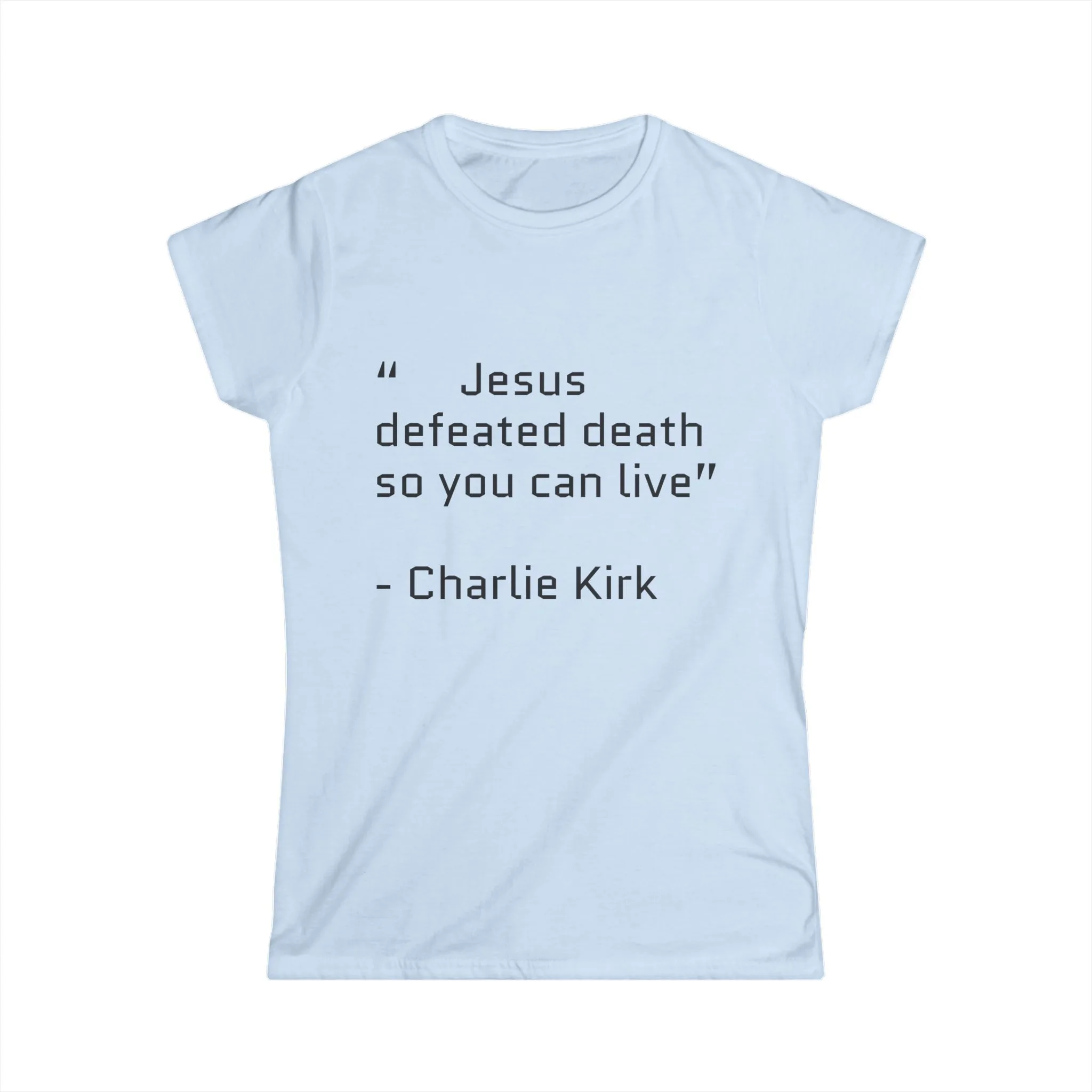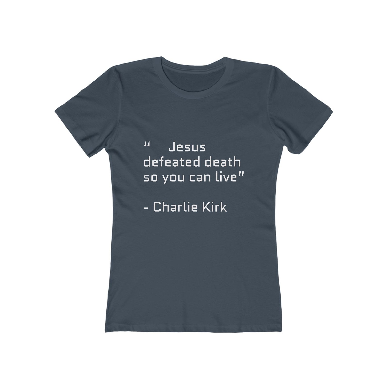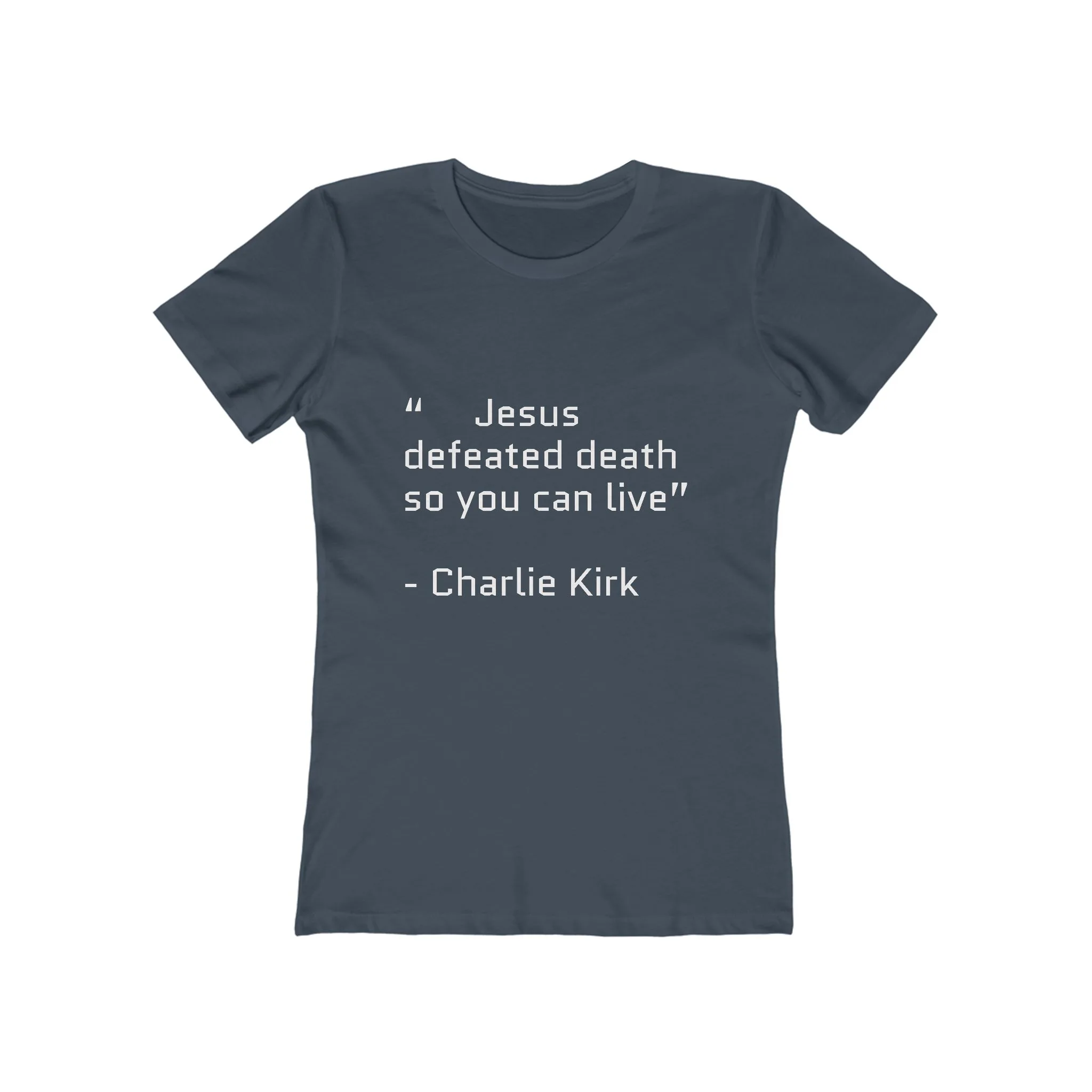 Charlie Kirk Memories Inspirational Graphic Tee Boyfriend Style Casual Fabric Women’s Shirt with Jesus Defeated Death Quote